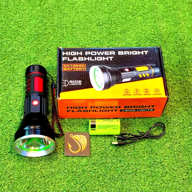 چراغ قوه طبیعت گردی و ماهیگیری برند :SIDE LIGHT دارای چهار باطری اصلی 38650A توان مجموع باطری : 10000MAH دارای SDL شارژر اصلی بسیار با کیفیت و قدرتی پرتاب نور بالا